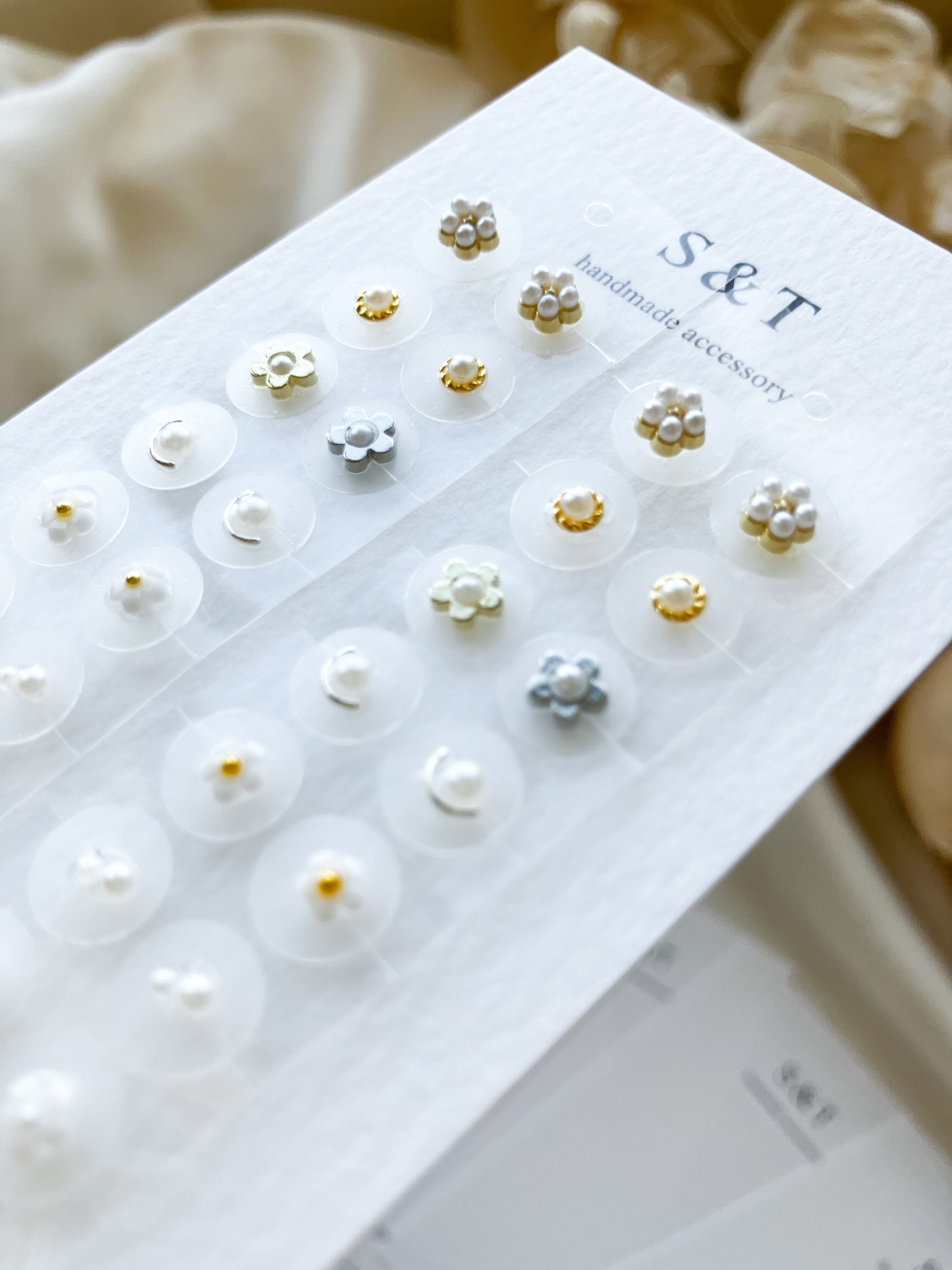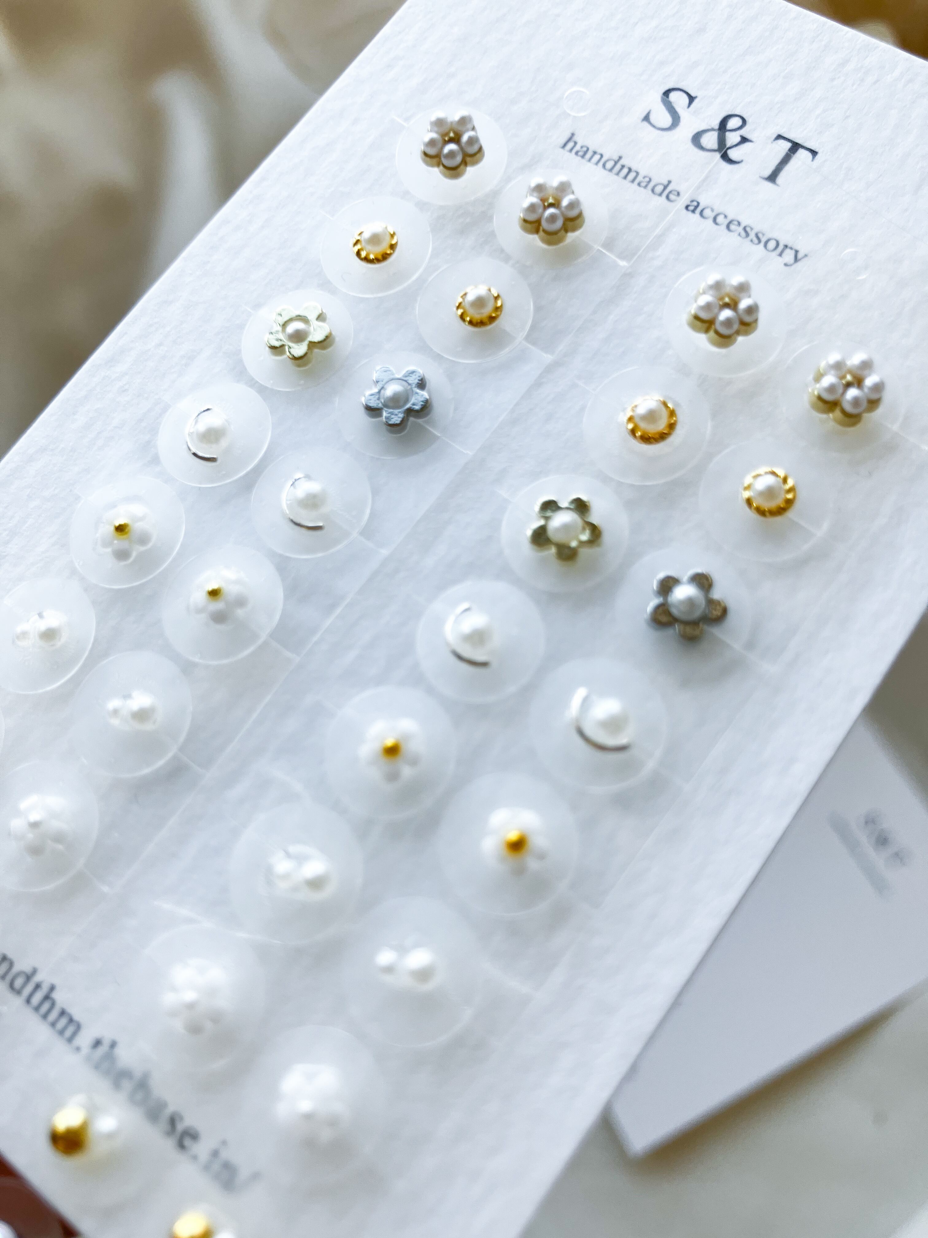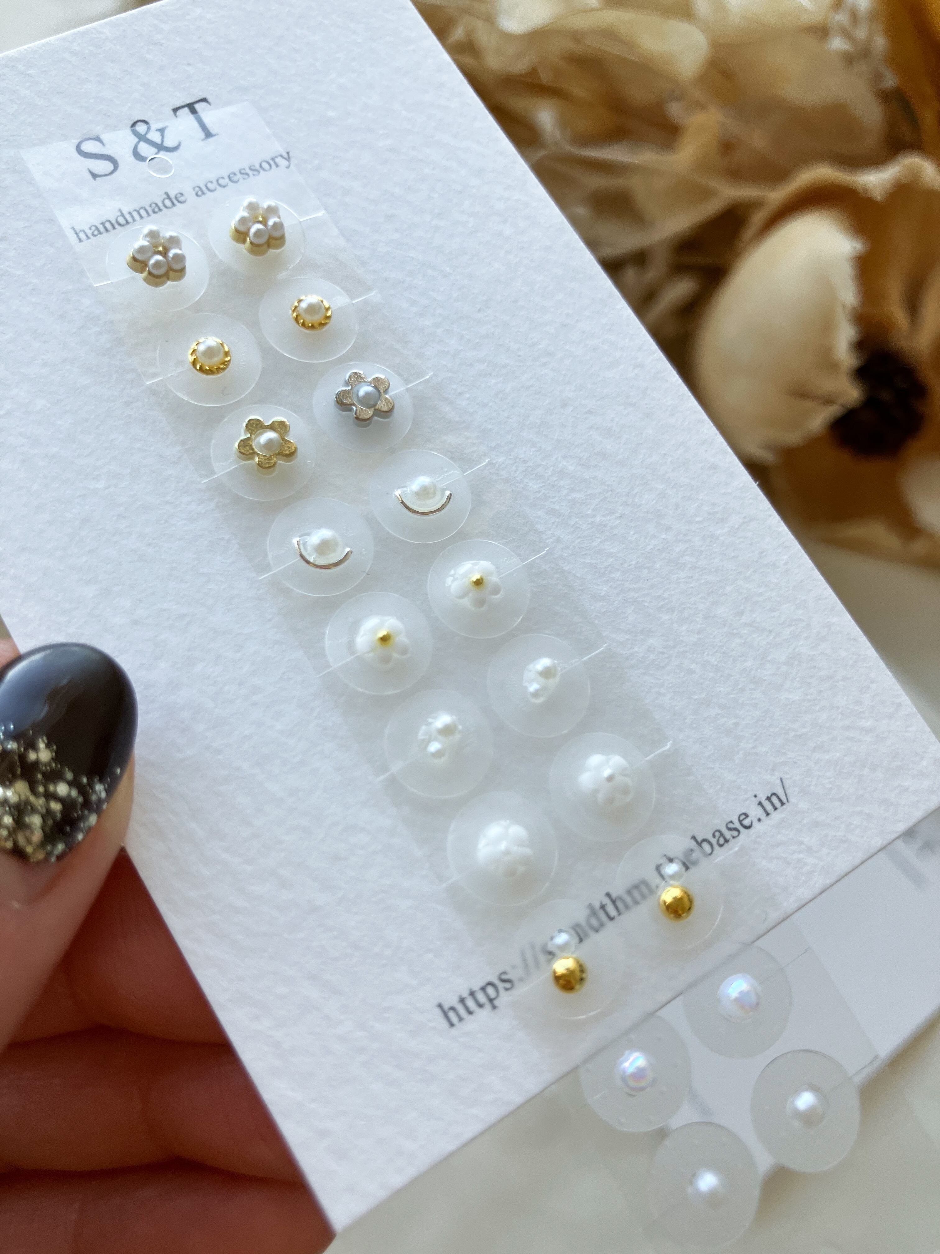 大人でも違和感なくつけられるフラワーデザインの耳ツボジュエリー。フラワーモチーフのデザインとパールやシルバー、ゴールドなどのデザインを織り交ぜています。どれをつけようか、組み合わせを選ぶのも楽しくなる1枚です。