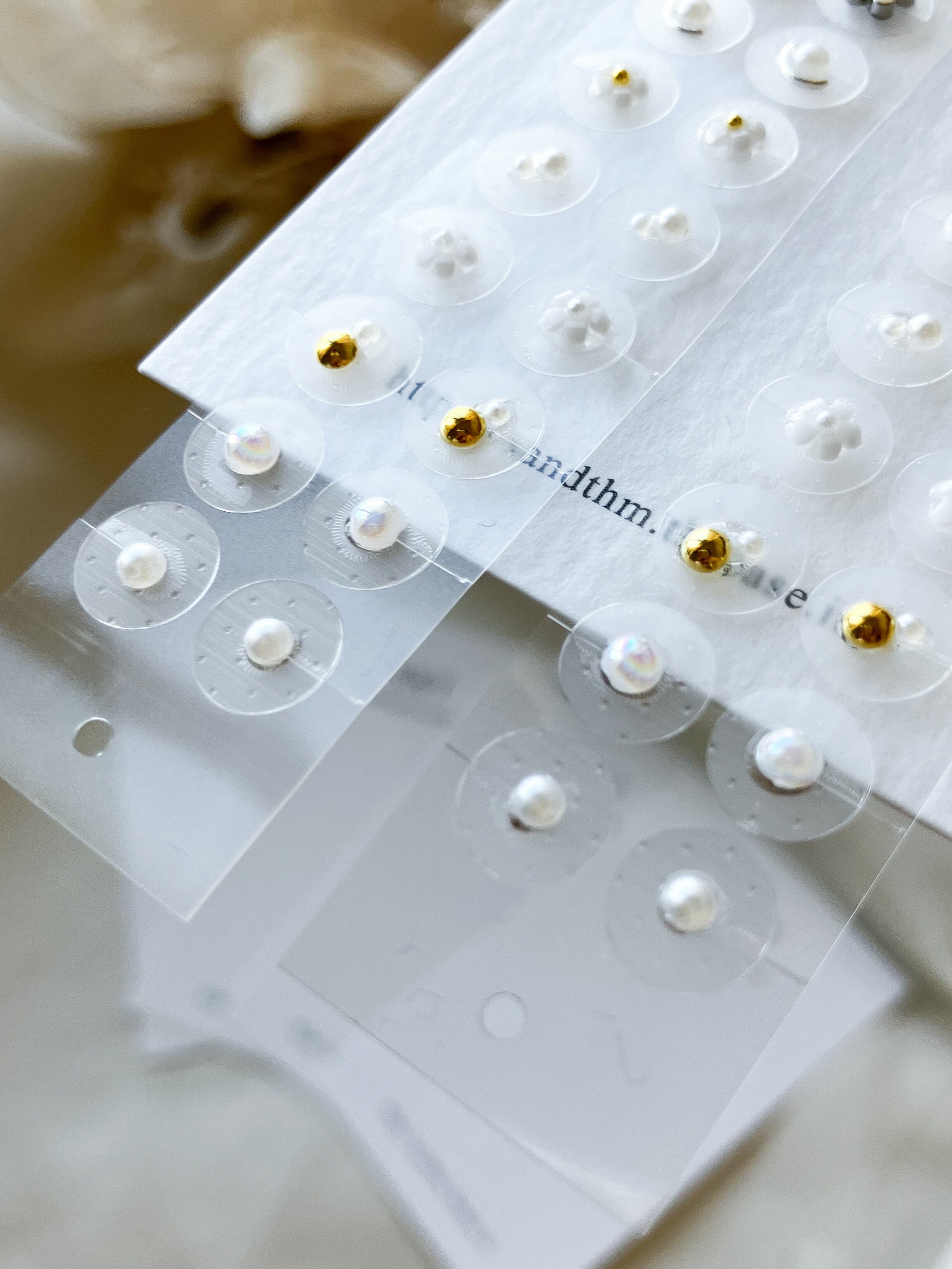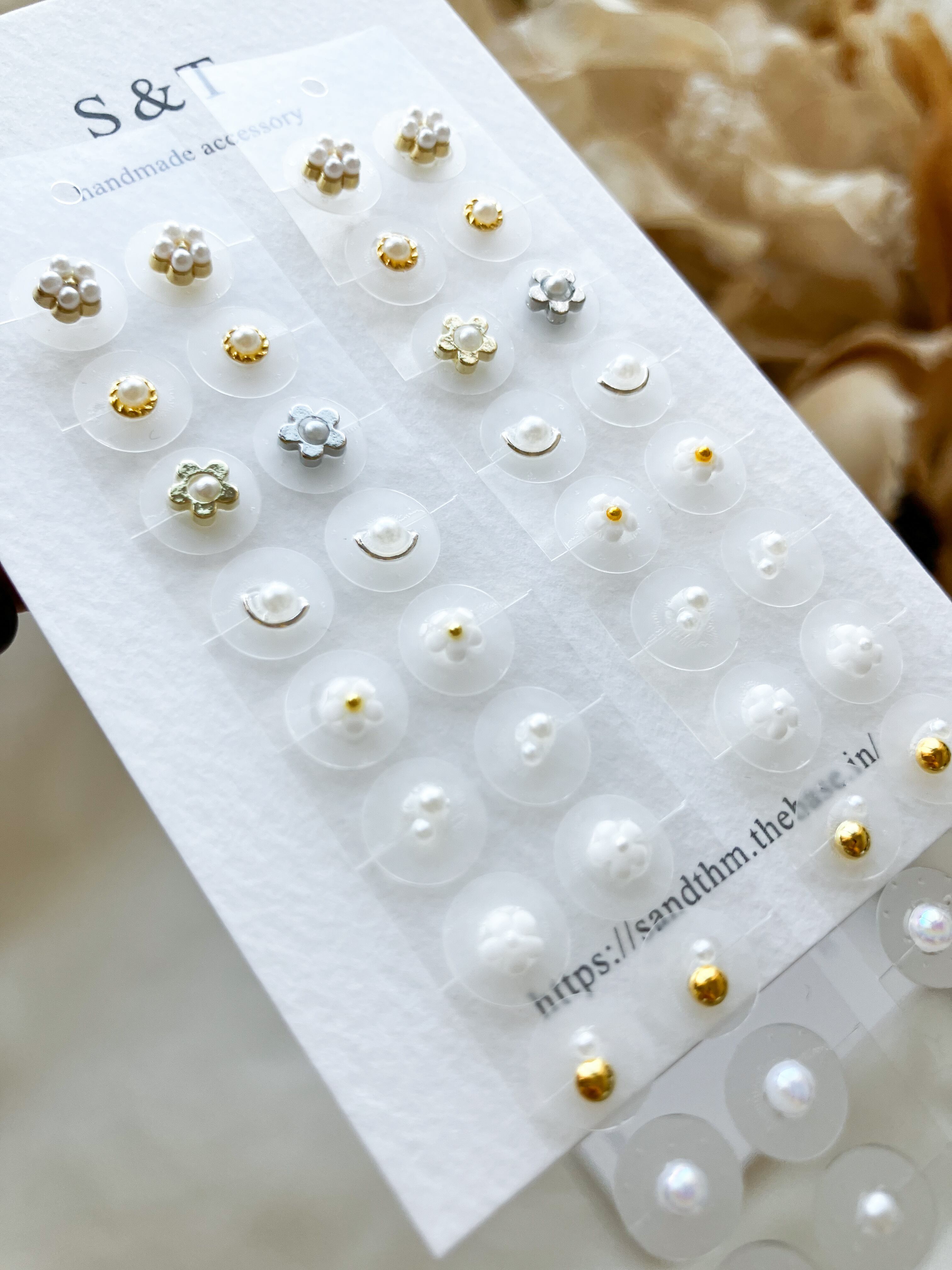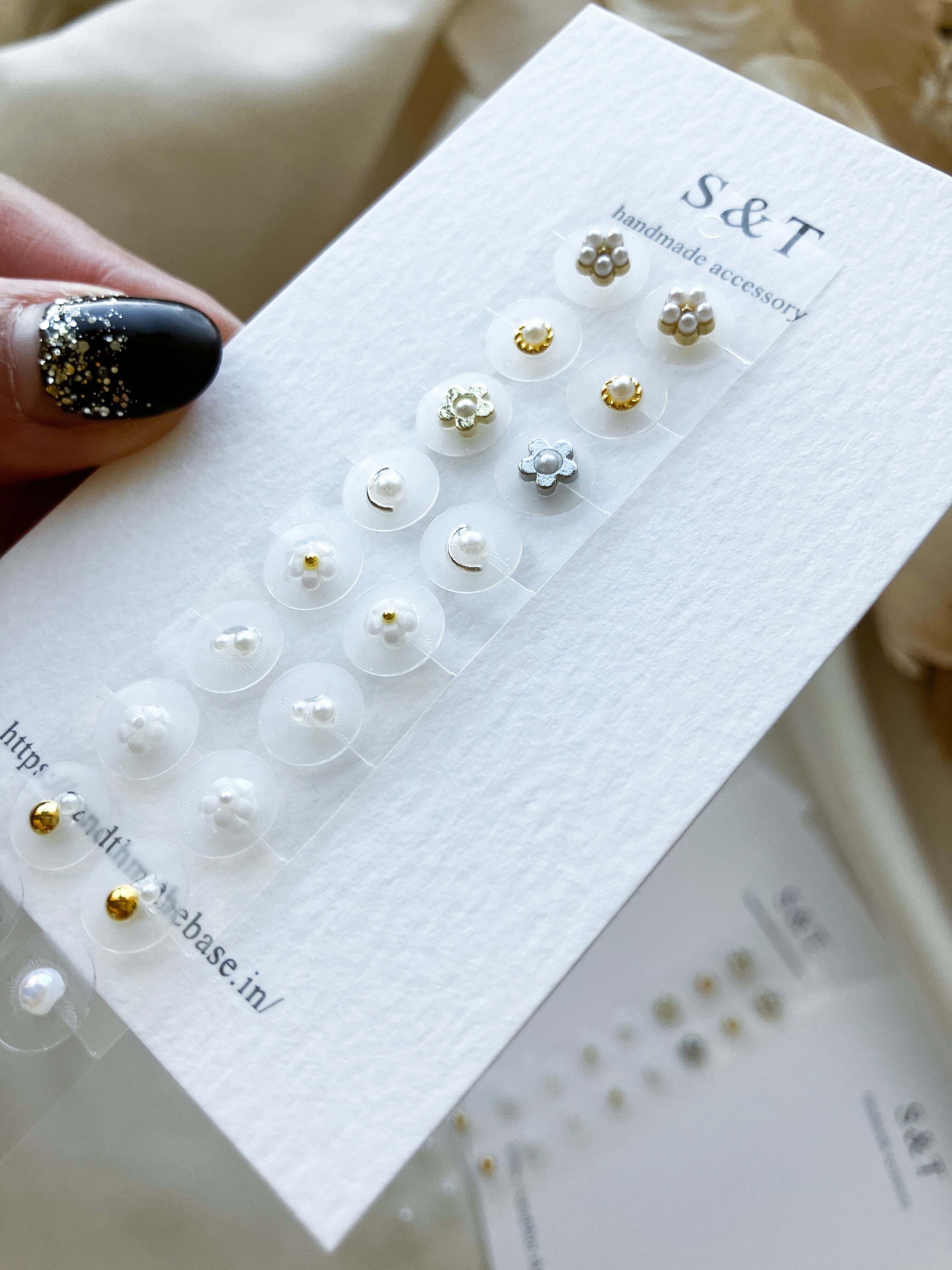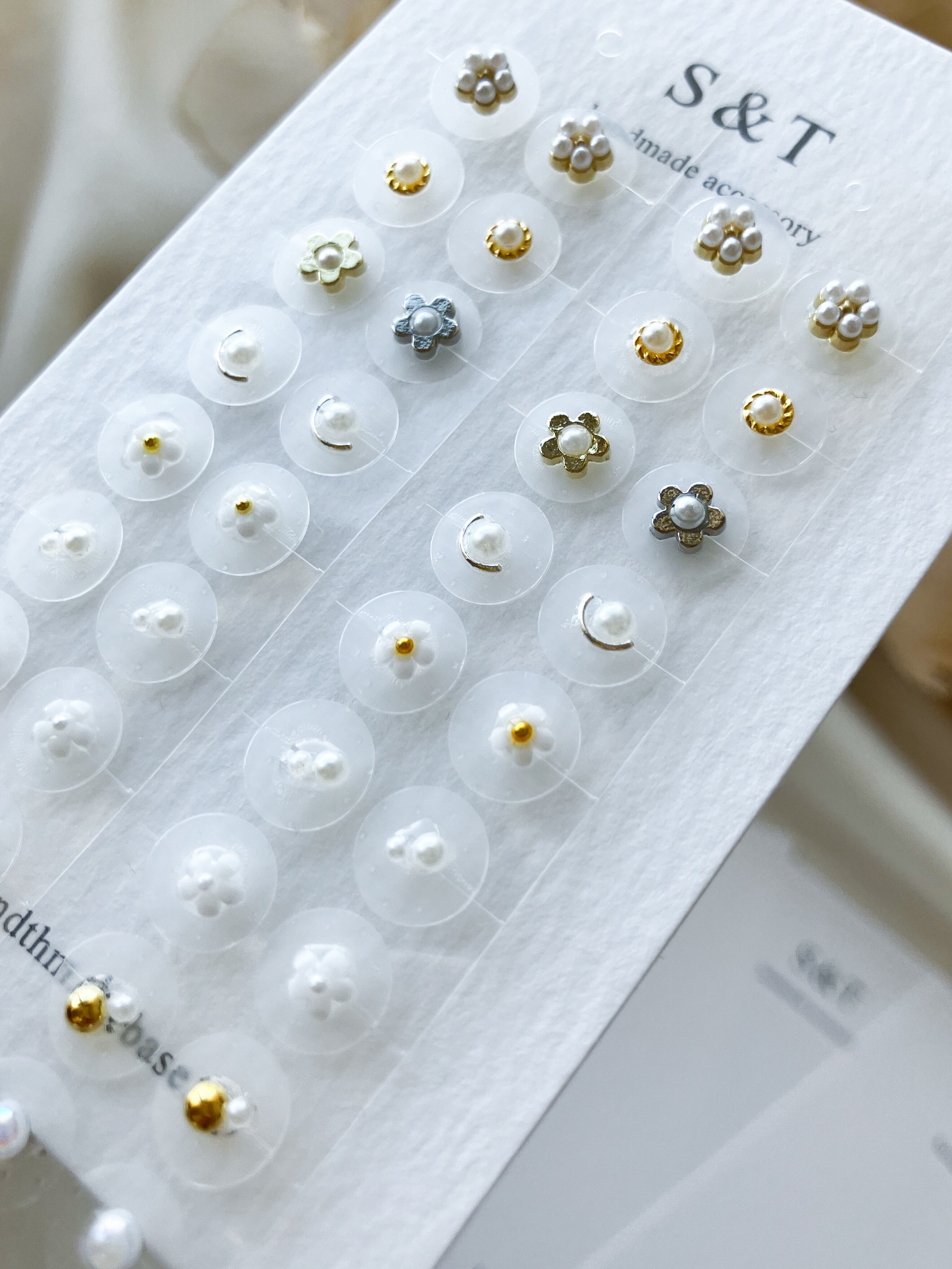 大人でも違和感なくつけられるフラワーデザインの耳ツボジュエリー。フラワーモチーフのデザインとパールやシルバー、ゴールドなどのデザインを織り交ぜています。どれをつけようか、組み合わせを選ぶのも楽しくなる1枚です。