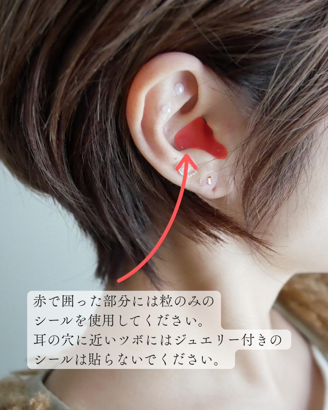 ・耳の穴に近いツボにはジュエリーなしの粒のみのシールを貼ってください。