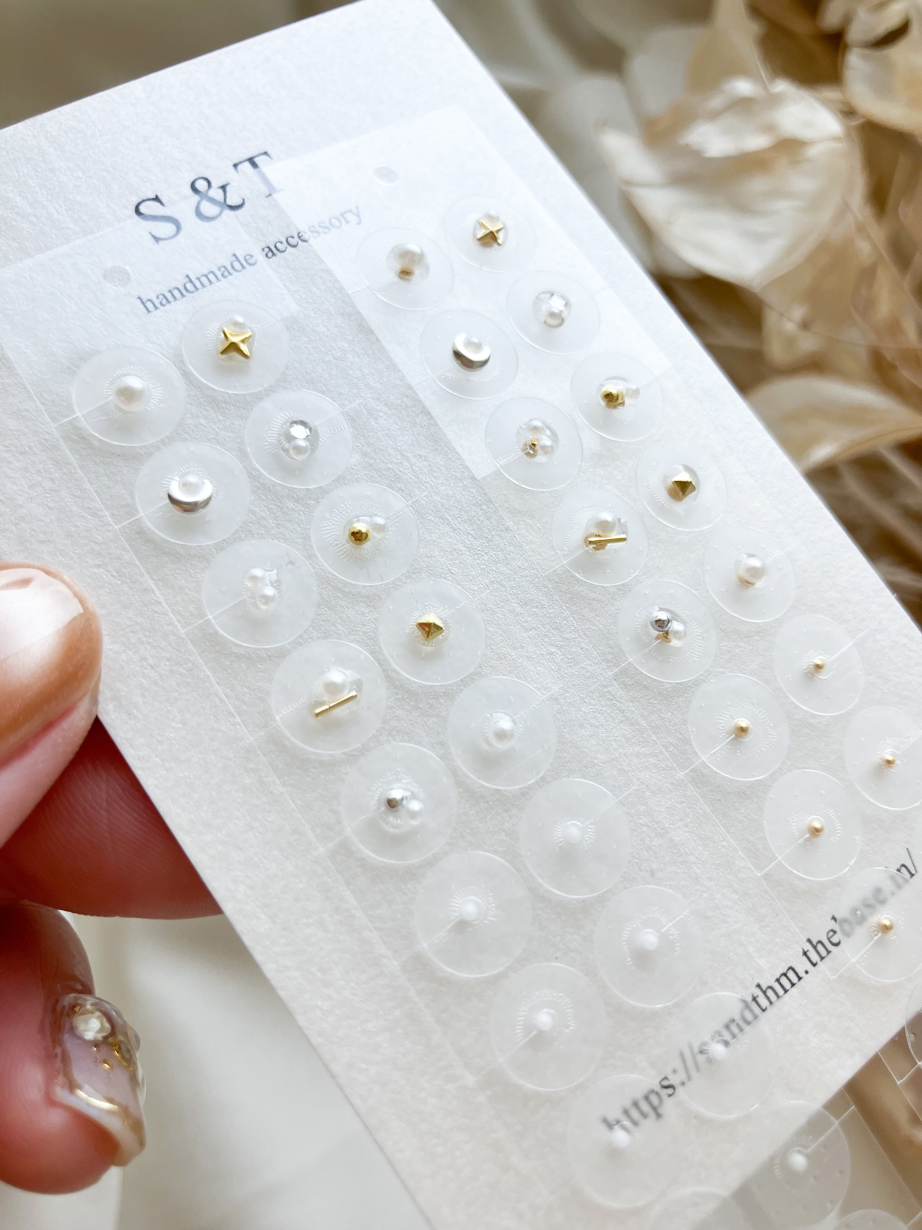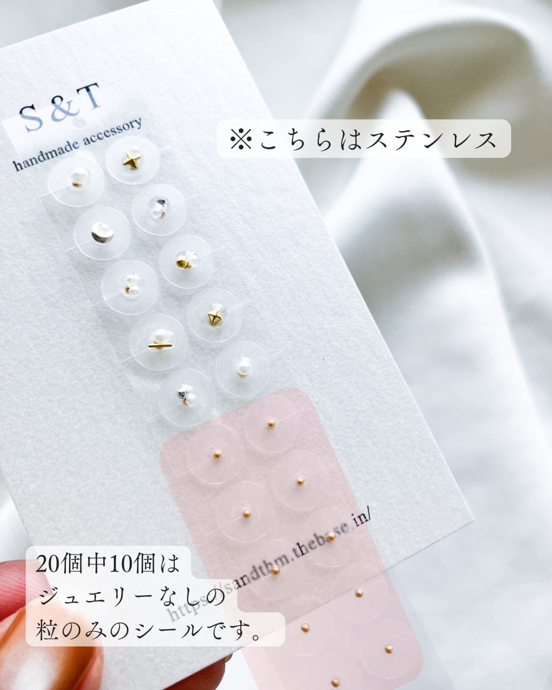 ステンレスまたは金属アレルギー対応のパール粒お好きな方をお選びください。(粒の色はステンレスはゴールド、パール粒はホワイトとなります)