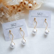 ツイストしたデザインのゴールドチャームの中にコットンパールを挟んだデザイン。